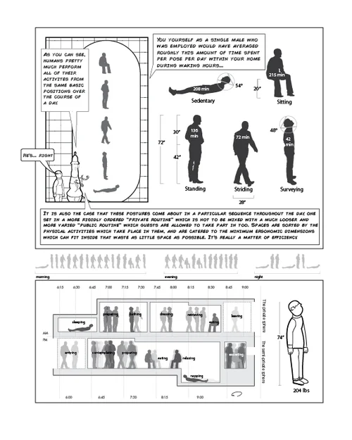 An introspective graphic narrative of the journey through architecture graduate school. Post-Humorism, a world divorced of open mindedness and a willingness to have fun, shows the dangers of obsessing over dogmas within the built spectrum. The playful Anti-Design works of designers from the 1970’s including the likes of Archizoom, Archigram, Koolhaas, and Super Studio taken literally as livable proposals for buildings would have made for a terribly dystopian environment by any practical account. However, taking a moment to consider these extremes played out ironically opens a conversation of “what if” in order to question the current status quo.